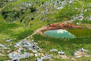 山顶的天然湖倒映蓝天白云
